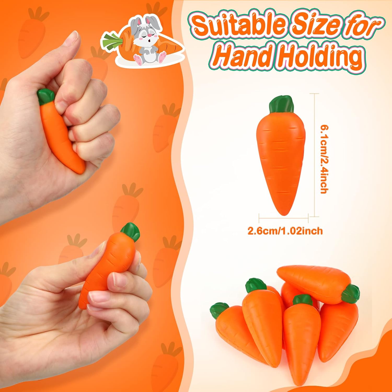 Features: Carrot fidget toys can help you relax during works or study in daily life, release your emotions and keep your physical and mental pleasure. Carrot stress ball toys are soft, reliable and comfortable for people to press, stretch, twist, and more, with good rebound ability, not easy to deform or break. Specifications: Material: PU foam Color: orange and green Size: approx. 1.02 x 2.4 inches/ 2.6 x 6.1 cm Package includes: 100 x Carrot anxiety toys Notes: Manual measurement, please allow slight errors on size. The color may exist a slight difference due to different screen displays