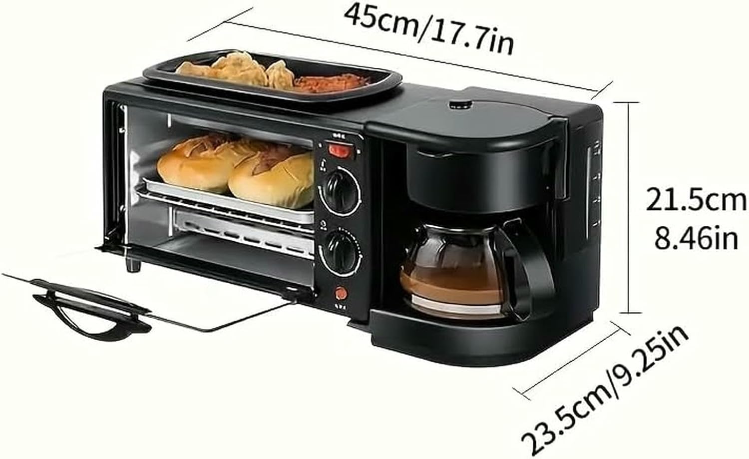 Transform your morning routine with this versatile 3-in-1 breakfast station that combines three essential appliances into one space-saving unit. The multi-functional breakfast maker features a coffee maker, toaster oven, and a non-stick griddle top, allowing you to prepare a complete breakfast simultaneously. The 2.38-gallon capacity toaster oven is perfect for baking fresh pastries, reheating leftovers, or toasting bread to perfection. The built-in coffee maker brews your favorite morning beverage while you cook eggs or pancakes on the generous non-stick cooking surface above. With simple control dials and indicator lights, this breakfast station is incredibly user-friendly. Its compact design makes it ideal for small kitchens, dorm rooms, or office break rooms while still offering full functionality. The durable black finish and modern design complement any kitchen decor. Whether you're making a quick breakfast sandwich, brewing coffee, or preparing a full family breakfast, this all-in-one station helps streamline your morning cooking routine. The unit's thoughtful design includes a removable crumb tray for easy cleaning and a glass coffee pot that keeps your beverage hot.