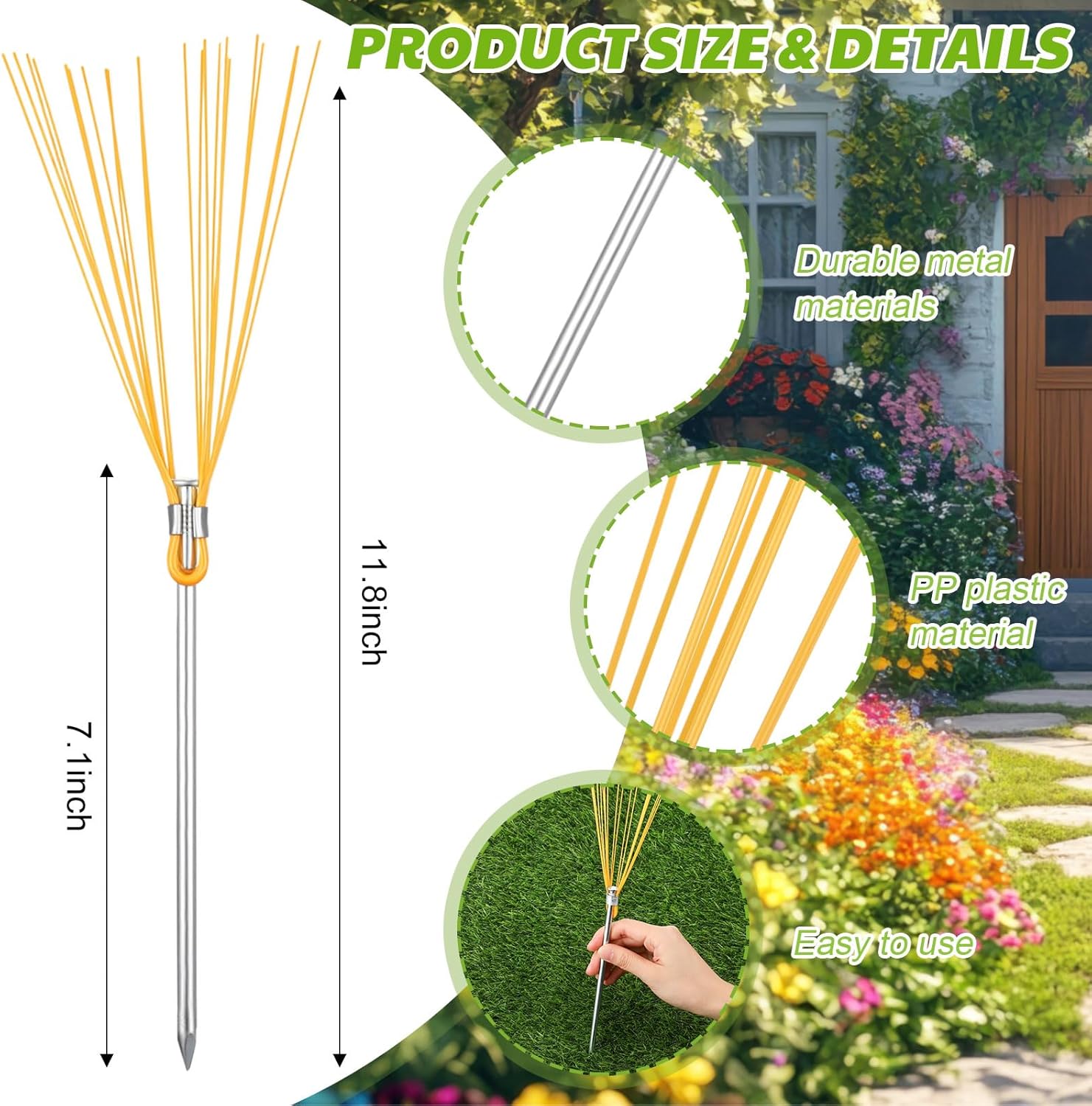 Features: Convenient for Temporary and Permanent Marking These markers can be left in place for ongoing projects or easily removed and reused. Their durable construction supports both short term layout work and long term boundary indication. Organized Project Planning Tool The 50 piece set provides ample markers for large or detailed outdoor projects. Helps maintain clear visual reference points for gardening, construction, and landscape design tasks. Material: galvanized metal and PP plastic Color: yellow Size: Total length: about 30 cm/ 11.8 inches Stakes: about 18 cm/ 7.1 inch Package includes: 50 x Yellow Ground Marking Whiskers Notes: Manual measurement, please allow slight errors on size. The color may exist a slight difference due to different screen displays