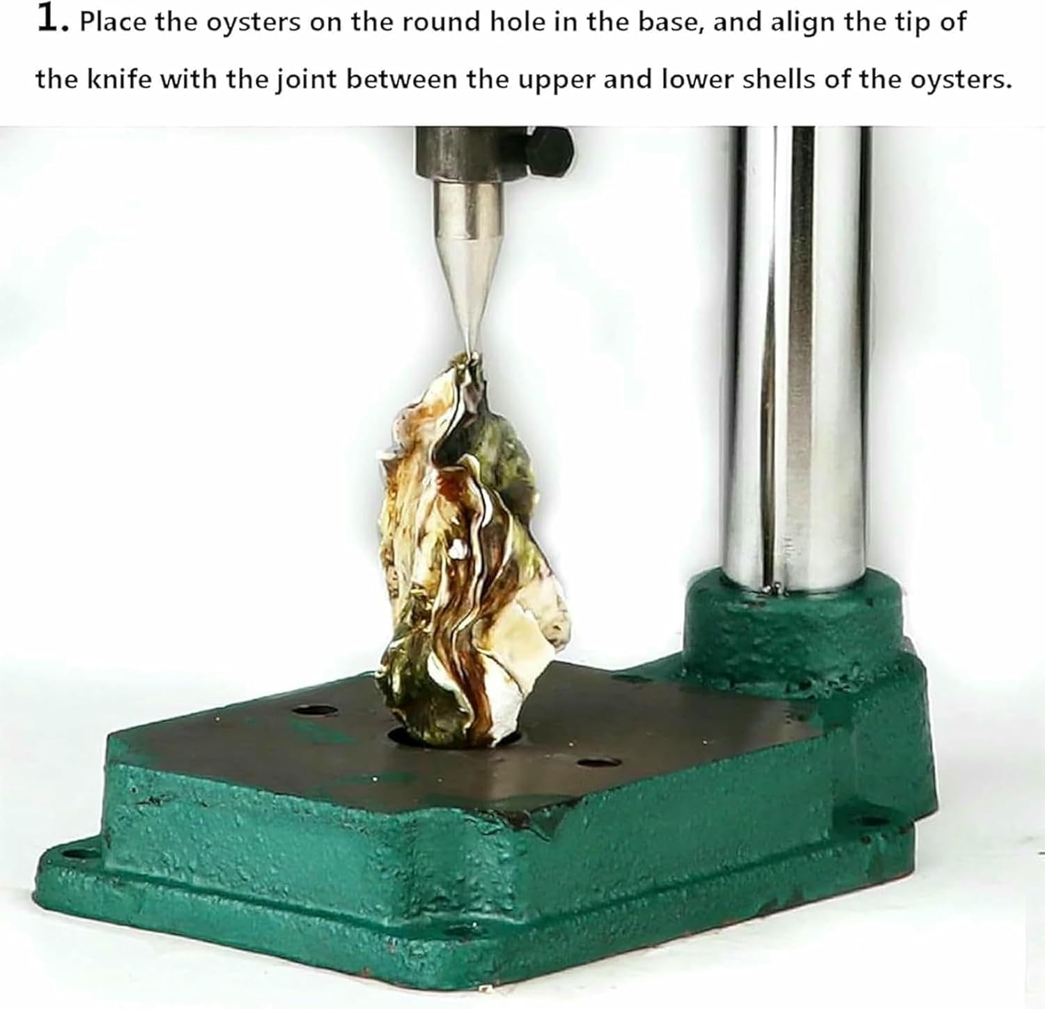 Features.--Casting base, mould casting base, stable when using the worry; free lifting, through the lifting screw adjustment, to meet the use of more specifications; energy-saving rocker, leverage the principle of energy-saving, gently provide a hundred times the pressure.Spec.Name:Oyster ShuckerMaterial:304 stainless steelTip Angle:60° or moreMachine Height:36CMBase length:15CMWidth of base:12CMPanel width:11CMPanel length:13CMThroat depth:10.3CMGDownward stroke:6.1CMGross Weight:5KGMachine Pressure:≧150KGColour:GreenApplicable people:AdultPackage.Oyster Shucker*1Knife*2Glove*1Hexagonal Wrench*1Open End Wrench*1