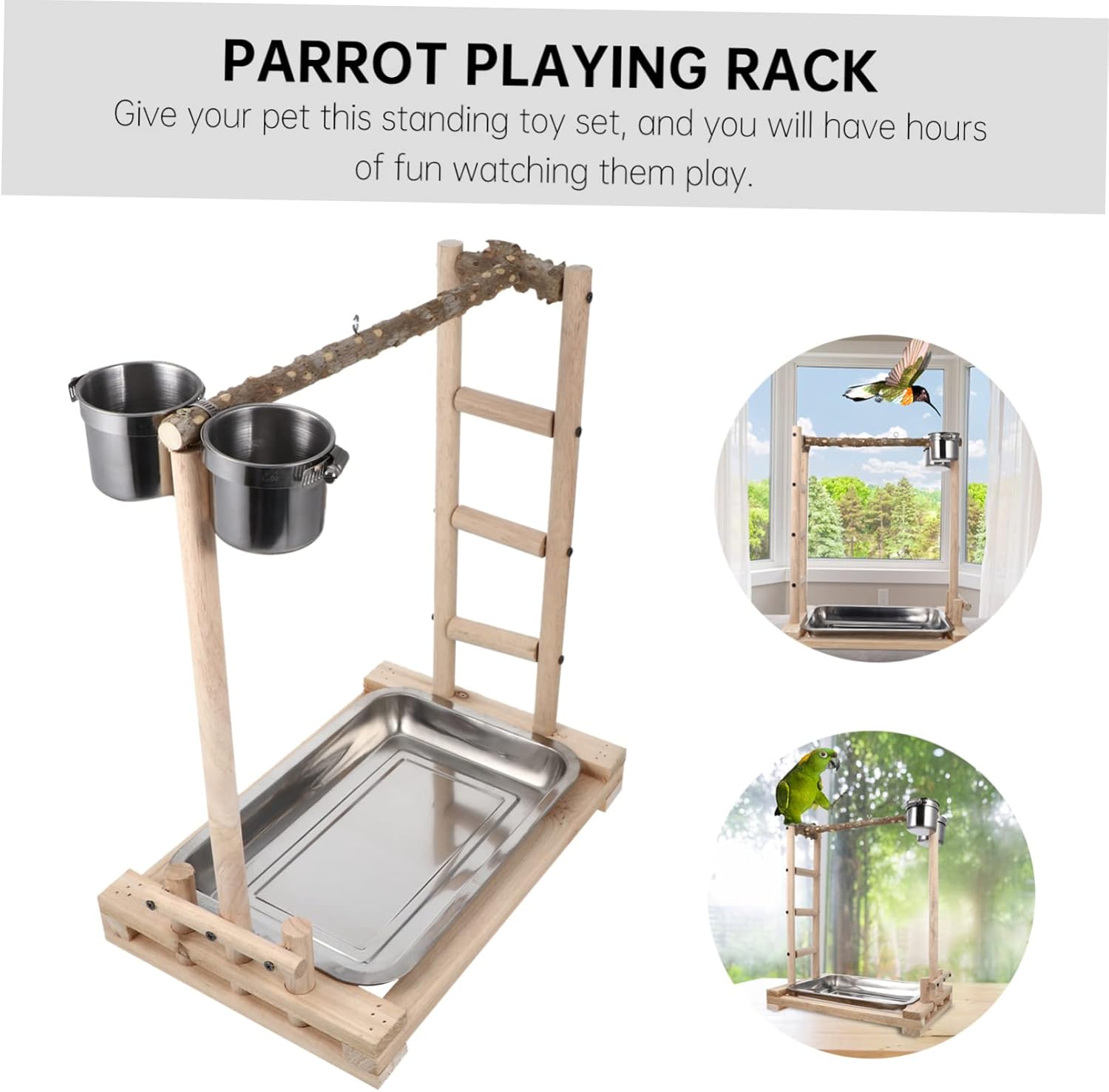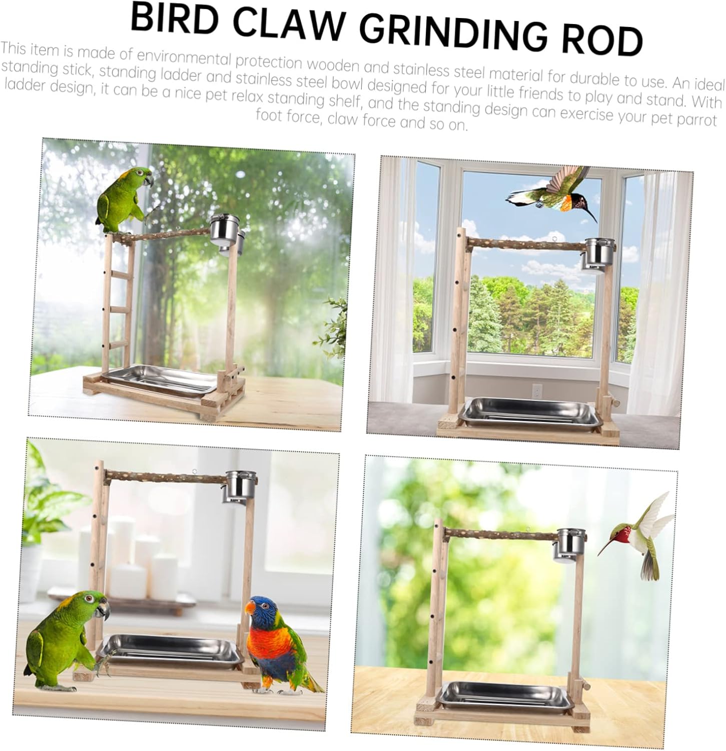 Package List 1 x Parrot Rack Characteristics -Color:Multi Bird Standing Ladder -Material: Wood, stainless steel Stainless Steel Bowl Feeder -Size: Approx. 36.00X24.00X45.00cm; 14.15X9.43X17.68in Practical Bird Ladder - It is the playground for your little parrot chewing, adventuring and desiring to explore Wooden Parrot Climbing Ladder. - A great parrot that promotes fun and exercise Training Ladder. - Made of wooden and stainless steel material for long-lasting use Creative Bird Training Rack. - A ladder and feeding bowls design that will keep the pet entertained while developing their skills and let them be fed easier Bird Standing Rack. - A great for cockatiels, parakeets, parrots and other small birds Parrot Plaything.Goods DescriptionBird Claw Grinding Rod The bird ladder to provide your beloved flying pet hours and hours of entertainment.Parrot Plaything It is the playground for your little parrot standing, chewing, adventuring and desiring to explore.Bird Stand Wood ladder design, which is visually appealing to pets