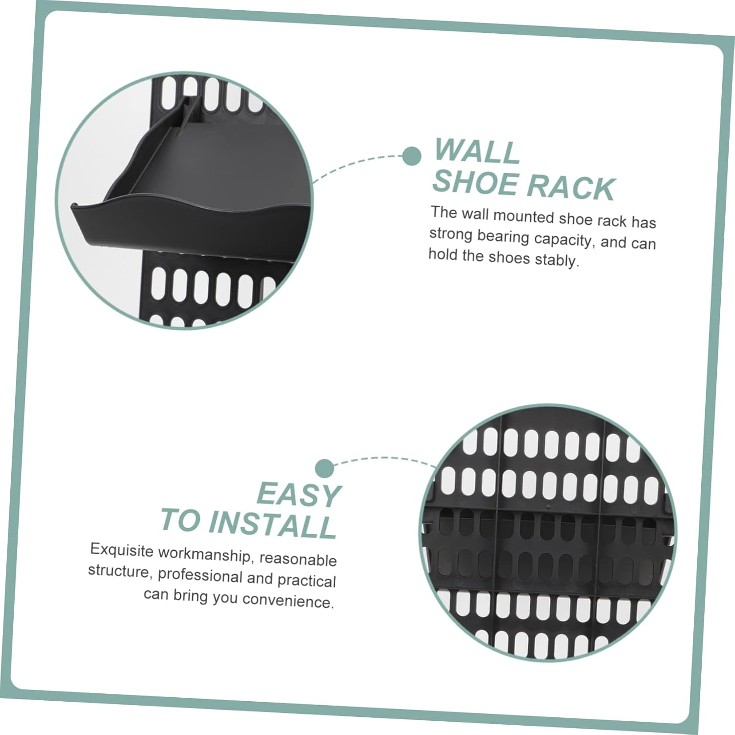 Package List 2 x Boards 4 x Shoes Trays Characteristics -Color:Black shoe storage shelf -Material:Plastic slippers shoe shelf - Size: 23.00X18.00X4.00cm/9.04X7.07X1.57in shoes storage hanger - Size: 41.00X29.50X1.00cm/16.11X11.59X0.39in no punching shoe organizer -The shoe rack can be installed on tile, stainless steel, frosted glass, wood panel, acrylic board, smooth glass, etc wall mount shoe storage. -You use of the wall, behind the door and corners to store slippers and casual shoes shoe organizer. -With adhesive design, no punch needed, very easy to install without any damage to your wall slippers storage rack. - of moist environment, easy to drain excess water, wear resistant shoe shelves for closet. -The wall mounted slipper storage rack is suitable for door back, bathroom, bedroom, front door, etc shoe holder.Goods Descriptionshoe shelves for closet The wall mounted shoe rack is a very accessory that will meet your needs well.slippers shoe shelf A wall mounted shoe rack, which is made of material, with texture, and .shoe rack for entryway Easy to install and use, it can be easily applied to your home