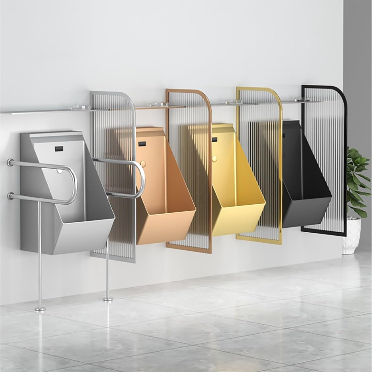 Wall Stainless Steel Urinal for Men Commercial Men's Flushing Urinal Intelligent Sensor FlushProduct DescriptionThe Intelligent Sensor Flush operates with a precise 60cm detection range. As a user approaches, the urinal initiates a powerful pre-flush for 3 seconds to wet the surface. Upon departure, it triggers a robust 6-second main flush, ensuring all waste is completely and efficiently evacuated.We have meticulously redesigned the internal structure of this men's bathroom toilet urinal to eliminate this common issue. The basin is significantly deepened and surrounded by raised splash guards, creating a larger internal target area. This intelligent engineering fundamentally contains fluid dynamics,completely no splashing and ensuring the surrounding floor remains clean and dry.This urinal comes equipped with a built-in, high-efficiency deodorizing device. The system is smart and responsive: when the urinal is in use, it allows for rapid water drainage, and when not in use, it automatically seals shut. This action traps and neutralizes odors before they can escape into the room.The urinal is constructed with a stainless steel body that undergoes a multi-layer brushed finishing process, combined with a nano self-cleaning coating. This surface is highly resistant to limescale, water stains, fingerprints, and grime. Dirt and have difficulty adhering to the ultra-smooth surface, allowing them to be rinsed away easily with water.To suit a wide range of interior design themes, from modern minimalist to industrial chic, this urinal is available in a variety of finishes. Choose from classic Silver, luxurious Gold, stately Bronze, or sophisticated Black. Each finish is applied with a sturdy, scratch-resistant coating, ensuring the product retains its modern and upscale appearance for years.Product Packaging1x Men's Adult Urinal1x Set of Installation HardwareNote:There may be an error of 1-3 cm.Images are for illustrative purposes; additional items shown are not included.Colors may vary slightly due to monitor differences.