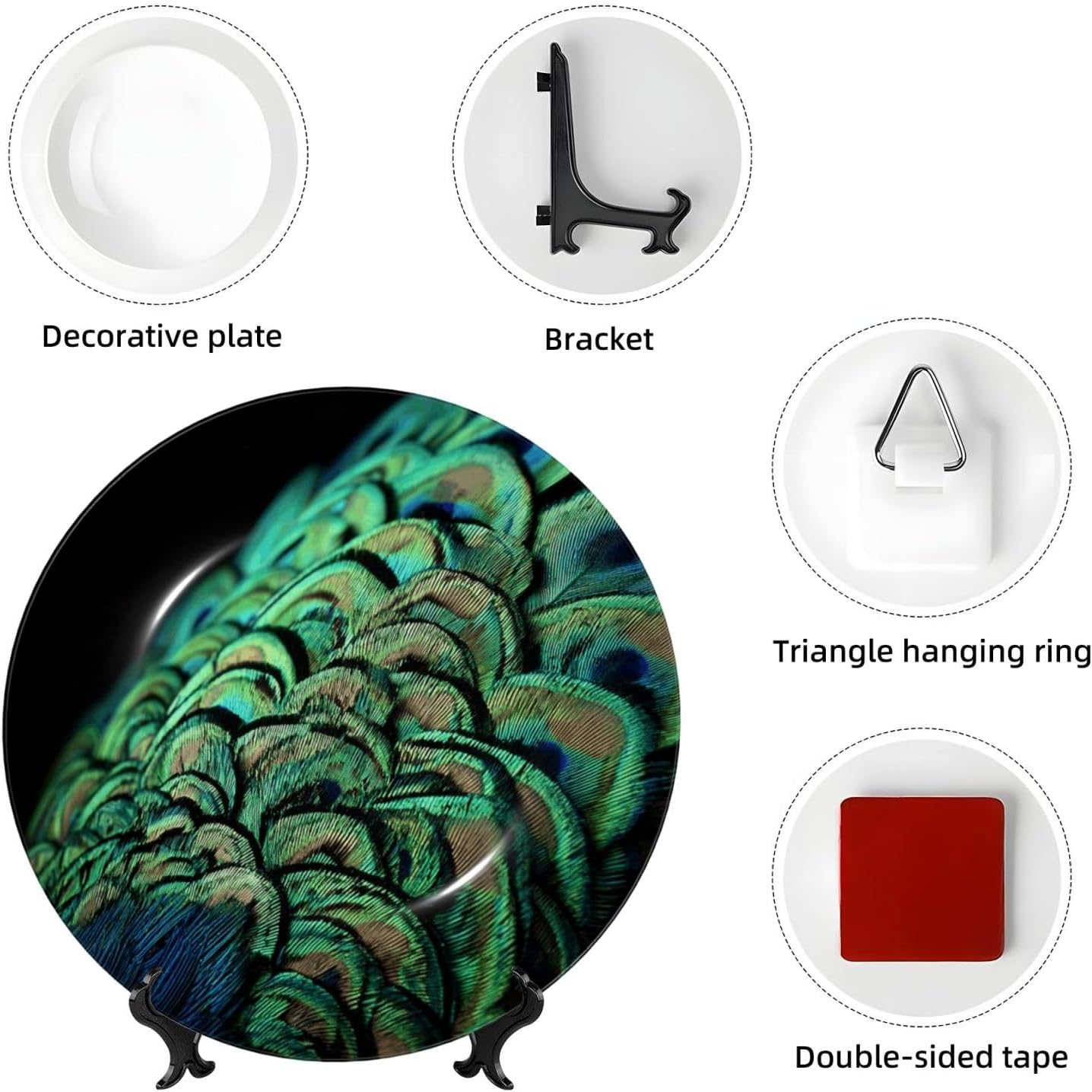 PORCELAIN PLATE DECORATION: Green Peacock Feather Crafts decorative plate painting decorative plates are worth sharing with your friends and family, showing your personality. Start with these fun and ceramic ornaments salad plates, refresh your roomsDIVERSITY OF USE: Porcelain dessert plates has a variety of placement methods, whether it is placed on the table with a base or hung on the wall, ceramic decorative plate is a very beautiful decoration. Dishes with display stand sturdy, versatile, and stylish, and everyone can use it safely, it is both beautiful and easy to cleanNO RISK: Crafts Decorative Plate is sturdy, versatile, and stylish, and everyone can use it safely. We will provides premium service to help solve any problem.Please feel free to contact us if you have any quality or transportation problems.