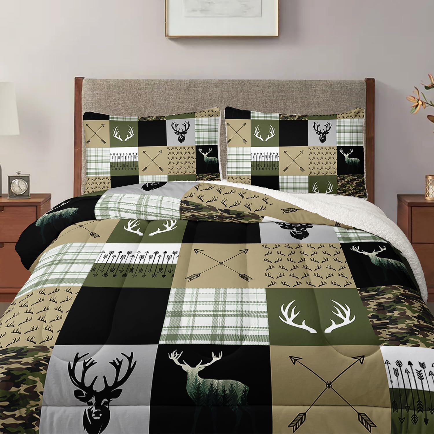 Deer Comforter Set Queen Size, Sherpa Lined Hunting Bedding, Green Camo Patchwork Quilt Set 3 Pcs, Rustic Cabin Bed Decor