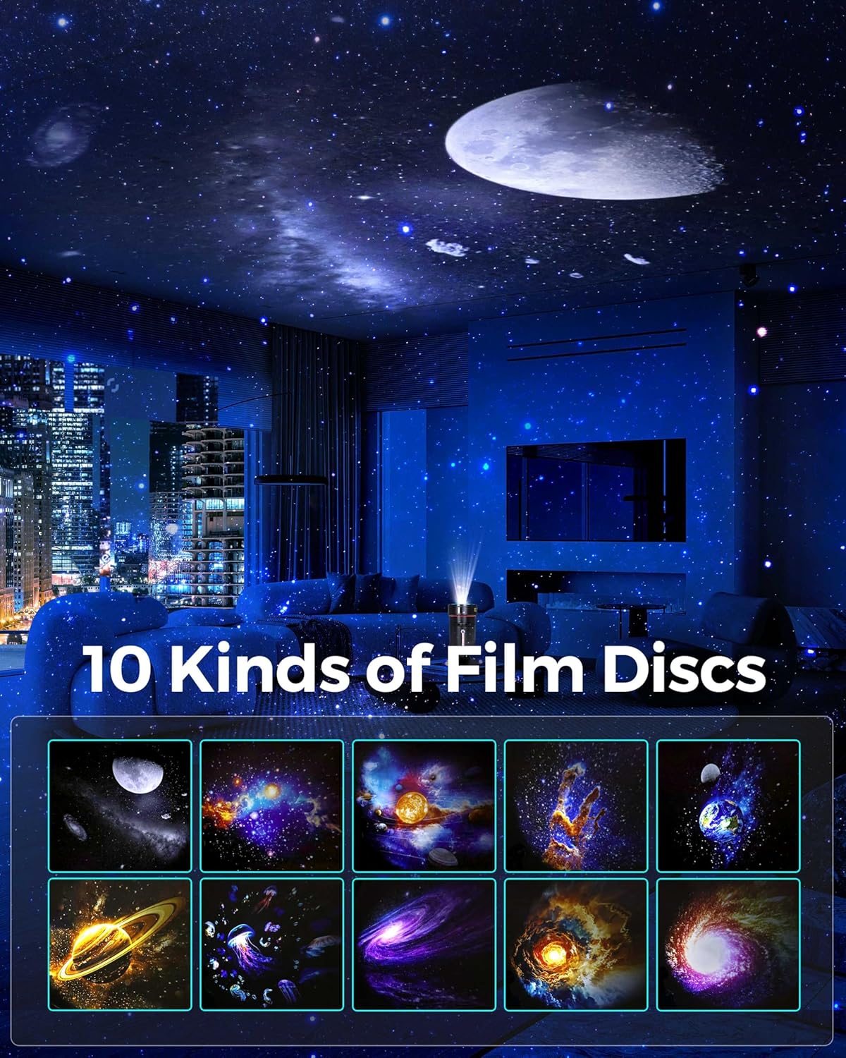| BuiltIn Media | • 1× Galaxy Projector (Planetarium 8th Gen) • 10× Glass Projection Discs (1 pre-installed in the projector) • 1× USB-C Charging Cable • 1× User Manual |
