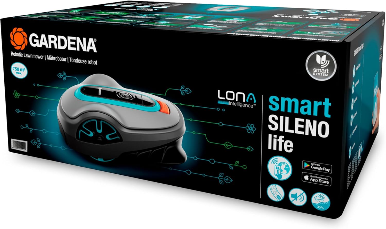 Gardena Smart Sileno life robot lawnmower 750 m²: smart care for medium-sized gardens. The smart Sileno life robotic lawnmower makes gardening easy and future-oriented. Equipped with artificial intelligence LONA Intelligence, reliable and independent work is guaranteed. Features such as intelligent mapping, zone management, area protect and location tracking make the robot a valuable helper for the garden. Already proven functions such as CorridorCut or the spottcutting principle are also installed in the robotic lawnmower. The Sileno life automatically returns to the charging station after each mowing process. In addition, the robot detects frozen ground and interrupts the mowing process to avoid damage. All functions of the robot lawnmower can be accessed via smart app (online registration required) and individually adjusted to your garden needs. The weatherproof and incredibly quiet garden aid (57dB(A)) can be integrated into the Gardena smartSystem and is a great addition to existing SmartHome devices. Voice control is possible via Alexa.