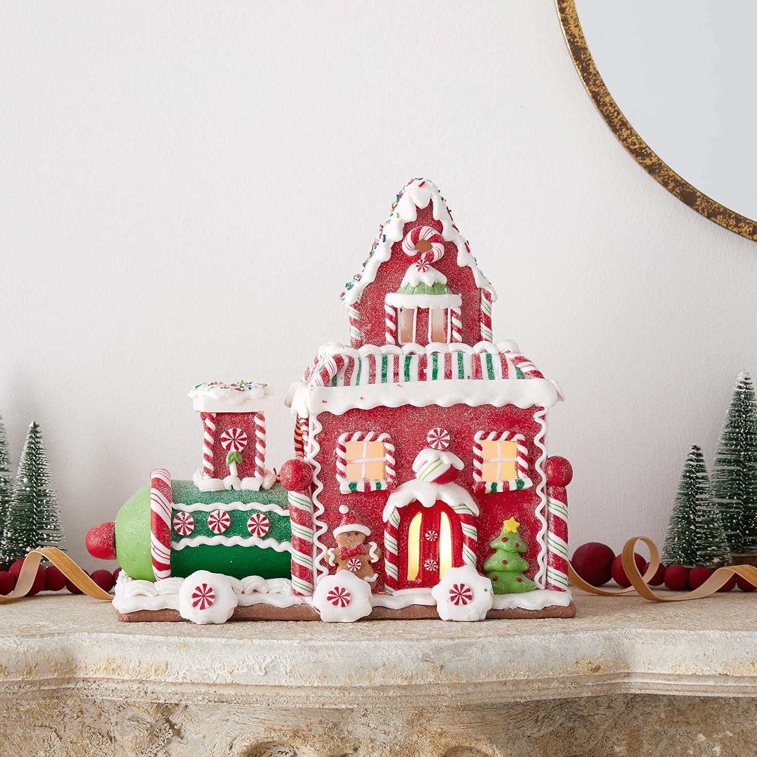 Add a sweet touch to your holiday décor with this Kurt Adler 10. 5-Inch Gingerbread Train House with LED Lights! This table piece features the shape of a train made of gingerbread cookies. Sprinkles, peppermint candy, and cookies adorn the sides of this house. When switched on, the train house are illuminated from within.