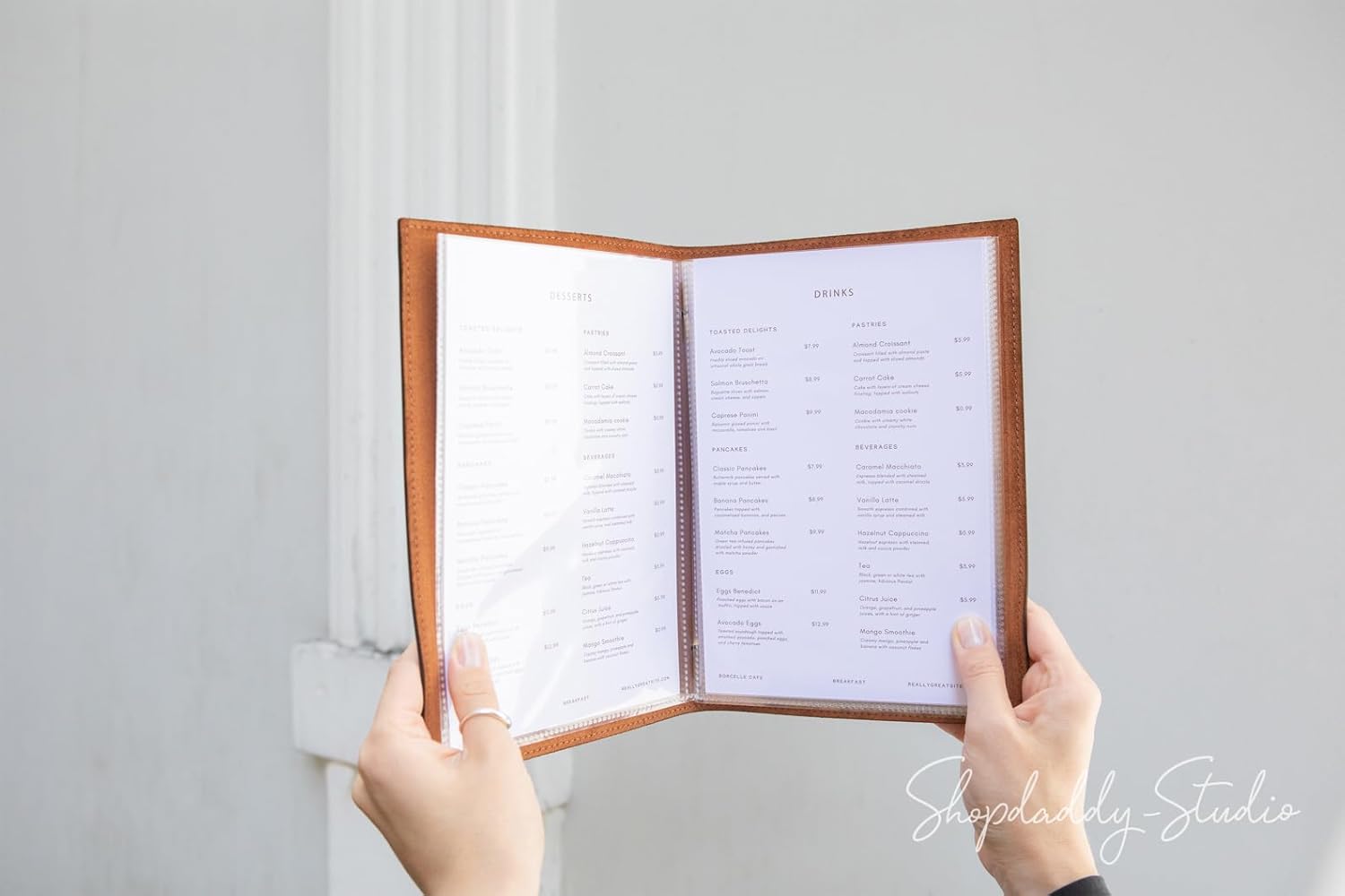 Our leather menu cover with plastic sleeves - is a perfect blend of classic menu design and convenience. The menu book features expertly done contour stitching, enhancing its visual appeal and adding a touch of artistry to its design. The key feature of our menu holders is the high-quality plastic sleeves. These sleeves are not only pleasant to the touch but also provide excellent protection for your paper menus. They act as a reliable guardian, shielding your menus from wear and tear as well as moisture damage. Durable, stylish, and functional, this restaurant menu folio is the perfect way to showcase your culinary delights impressively and professionally. With customizable options for blind embossing or gold foil-stamped logos, you can create a unique design that beautifully showcases your brand. ITEM DETAILS: You can choose the menu cover size by selecting from the "Paper Menu Size" option (for 8.5x5.5'' paper menu size on the photos) Available in different leather colors (Brown color on the photo) Plastic sleeves are used to house paper menus, ensuring their protection and longevity The menu cover includes 8 clear pvc plastic sleeves that are capable of holding 16 menu pages (or 8 double-sided printed paper sheets). Feel free to reach out if you require additional sleeves Your logo can be debossed Your logo can be engraved
