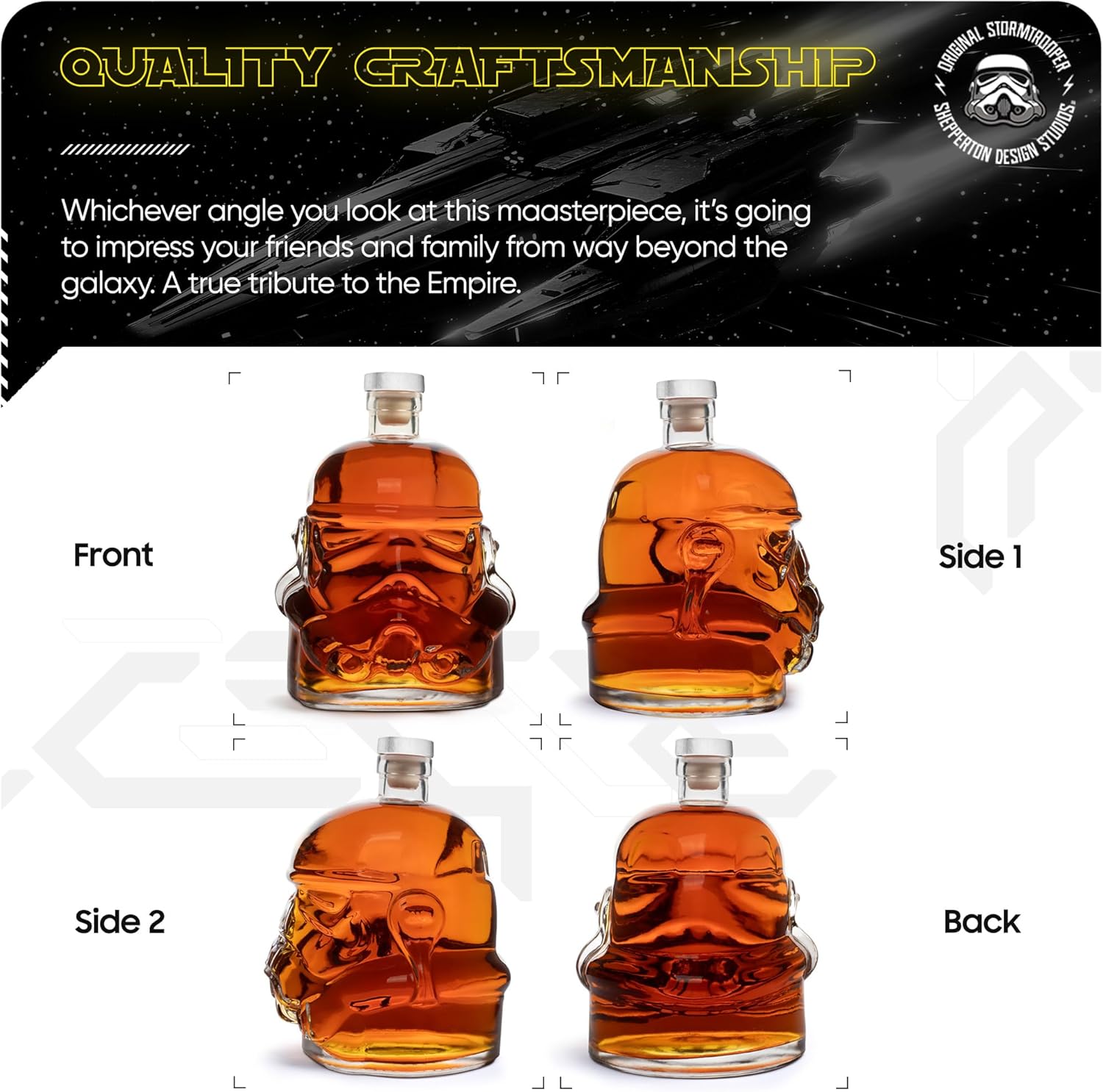 Product Description Store liqueur, decant wine and serve beverages. This stylish, high quality decanter is the perfect gift for any Stormtrooper enthusiasts. In 1976 prop maker Andrew Ainsworth of Shepperton Design Studios created the original Stormtrooper helmets and armour for the first movie. These products are based on the original moulds Andrew produced, as close as it is possible to get to the original film props. Accept no compromises! Set Contains: 1 x Stormtrooper Decanter