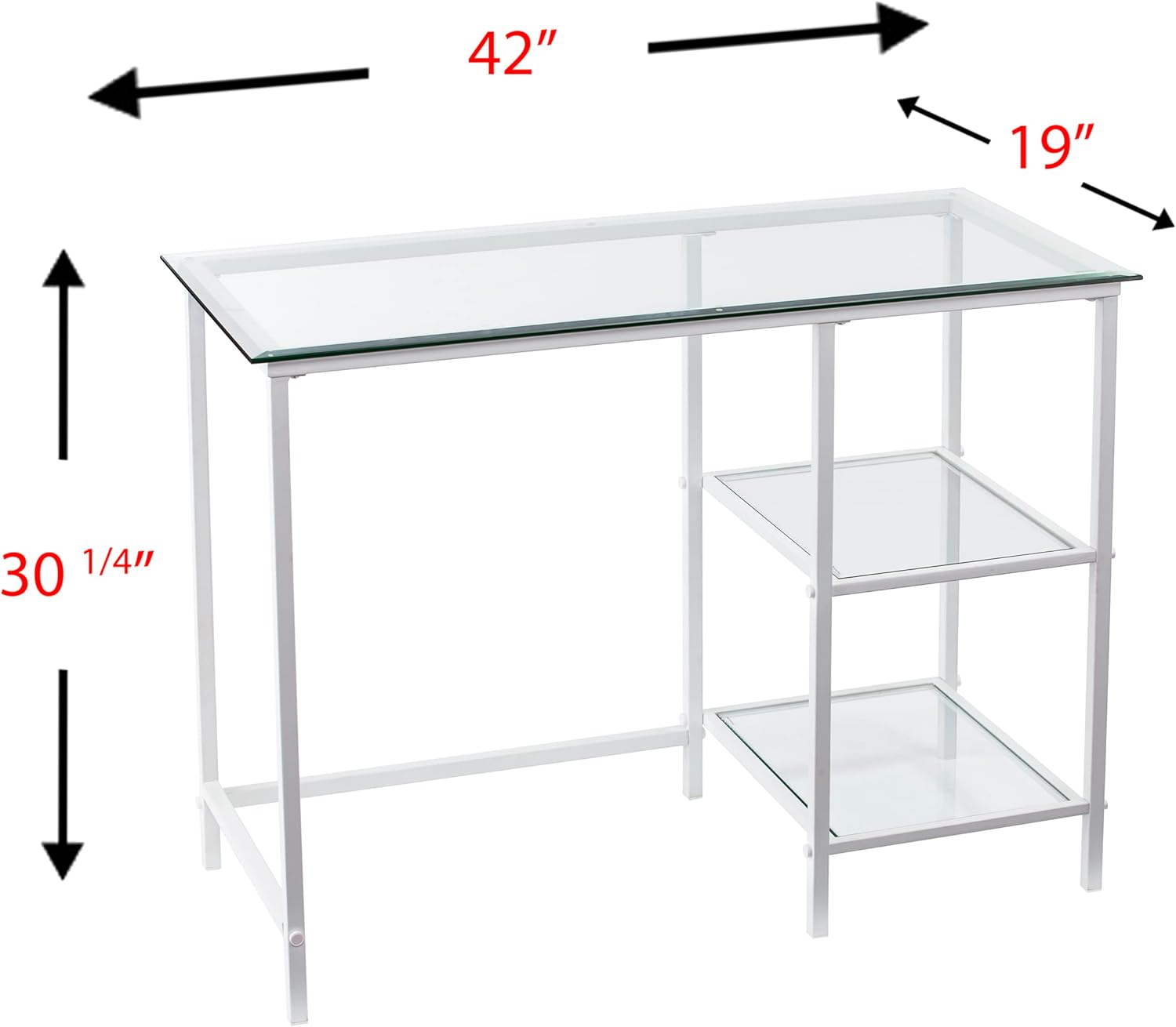Put your workplace on the straight and narrow with this contemporary metal and glass desk. Sturdy White metal frame combines with shatter-resistant tempered glass for ample work and shelving space. Sleek and simple, this versatile workstation easily multitasks as a Vanity desk in the dressing area, coffee bar in the kitchen, or crafting zone In a workroom.