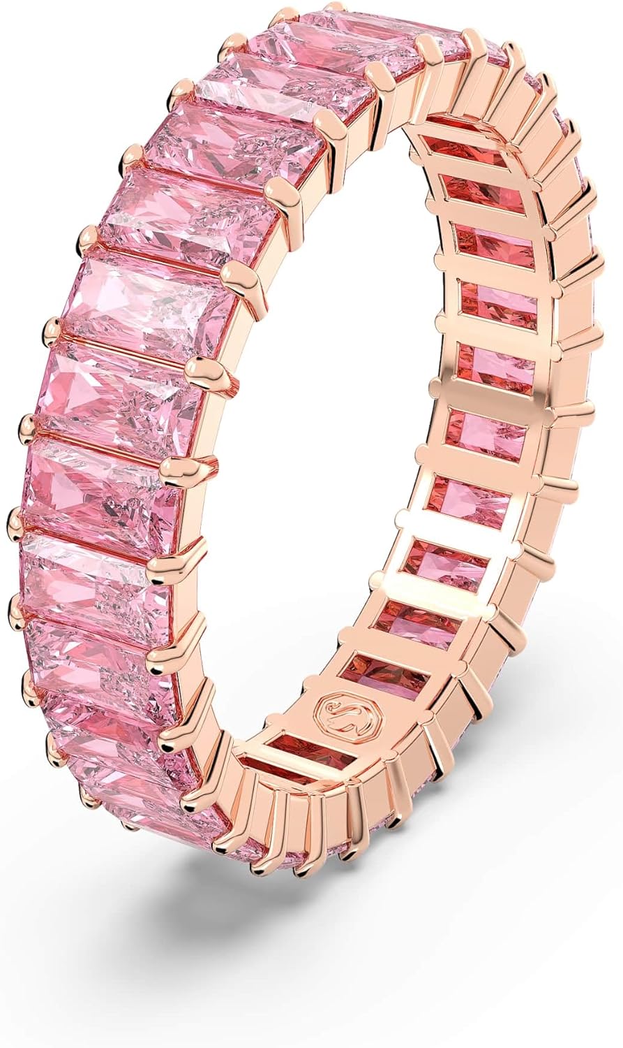 Swarovski Ladies Rings. Color: Pink. Metal Type: Rose Gold Plated. Gem stone type: Cubic Zirconia. Swarovski Ladies Matrix Baguette Cut Pink Ring. Crafted from a rose gold-tone plating and features a circle of pink stones in a beautiful baguette princess cut. Material: Rose gold-tone plated, Zirconia. Collection: Matrix.