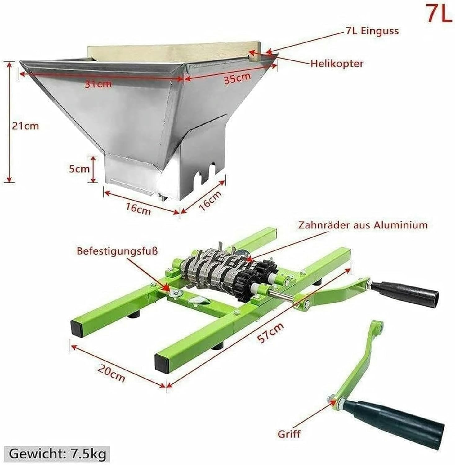 This manual press can arouse its desire for a slow rhythm life. It is a pleasureand can support the use of a lot of time.DetailDimensions: 570 x 480 x 240 mmDimensions of the hopper: 310 x 350 mmWeight: 7.5 kgCapacity: 7 litersMaterial: steel/plastic/aluminumSpecification1*fruit grinder with hand crankWhat to do with grape crops and other fruits and berries that have matured in their orchard? The best and healthier way is to judge them. Ideal for the home, the garden, the harvest season and the partyA fruit press is not only good to make the usual juice useful in the device to press honey, real gelatin or bee waxThese presses are adequate to press the juice of prehribulated grapes, red currants and many other fruits, vegetables and berries.This manual fruit and vegetable press is easy to disassemble for full cleaning.