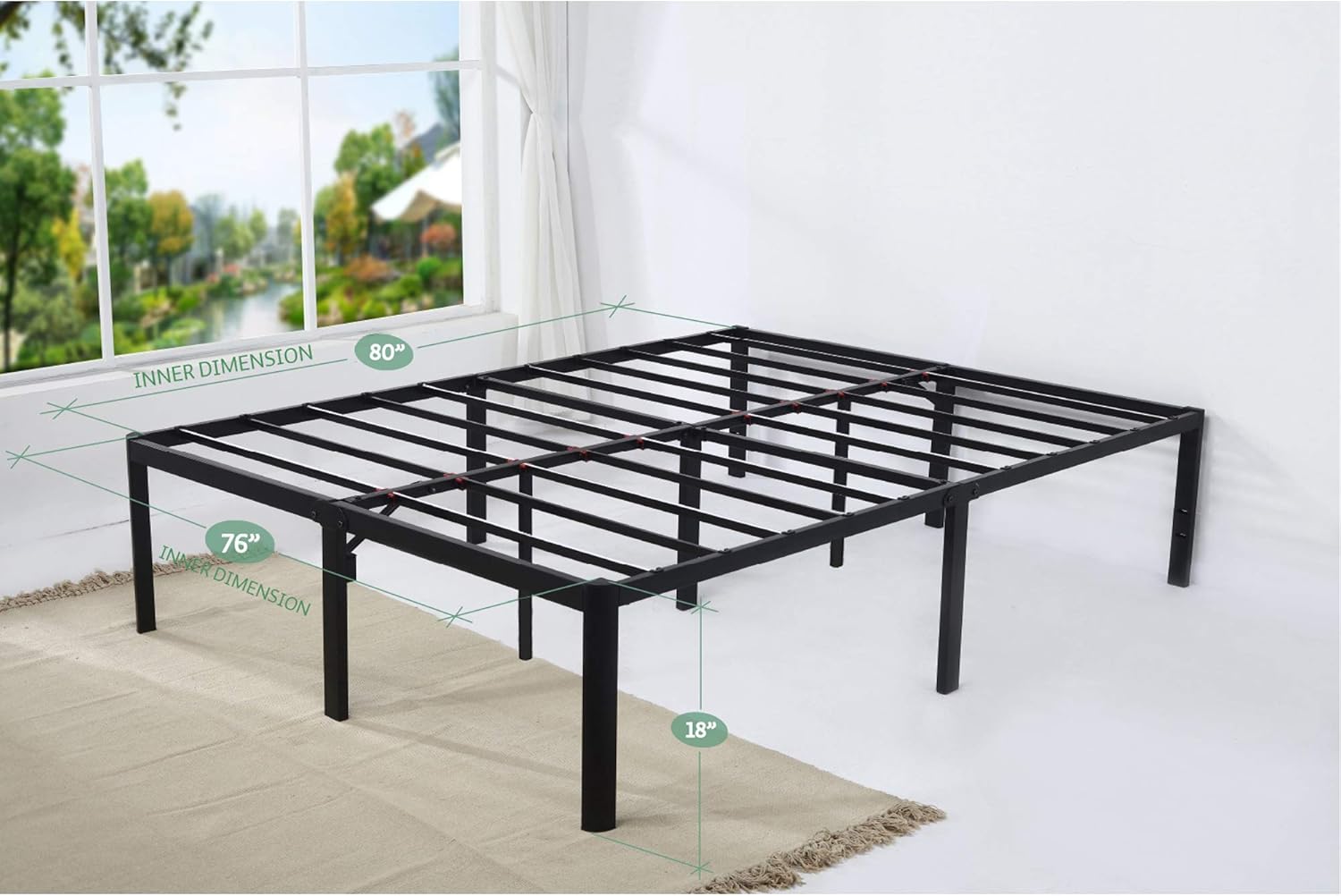 This sturdy, stable and durable 18 inch tall metal platform bed with steel slats replace a box spring. No box spring needed. Double sliding protect system 1. Applying double adhesive tape. 2. Encasing a mattress. So customers can find that this frame is a bit bigger than standard frame as it is designed to encase a mattress by 5mm deep frame Size: twin-41. 5(W) x 77(l), full-55. 5(W) x 77(l), queen-61. 5(W) x 82(l), king-77. 5(W) x 82(l) inch. material type - Metal. included components - Frame - Screw kit,Instruction. fabric type - Steel
