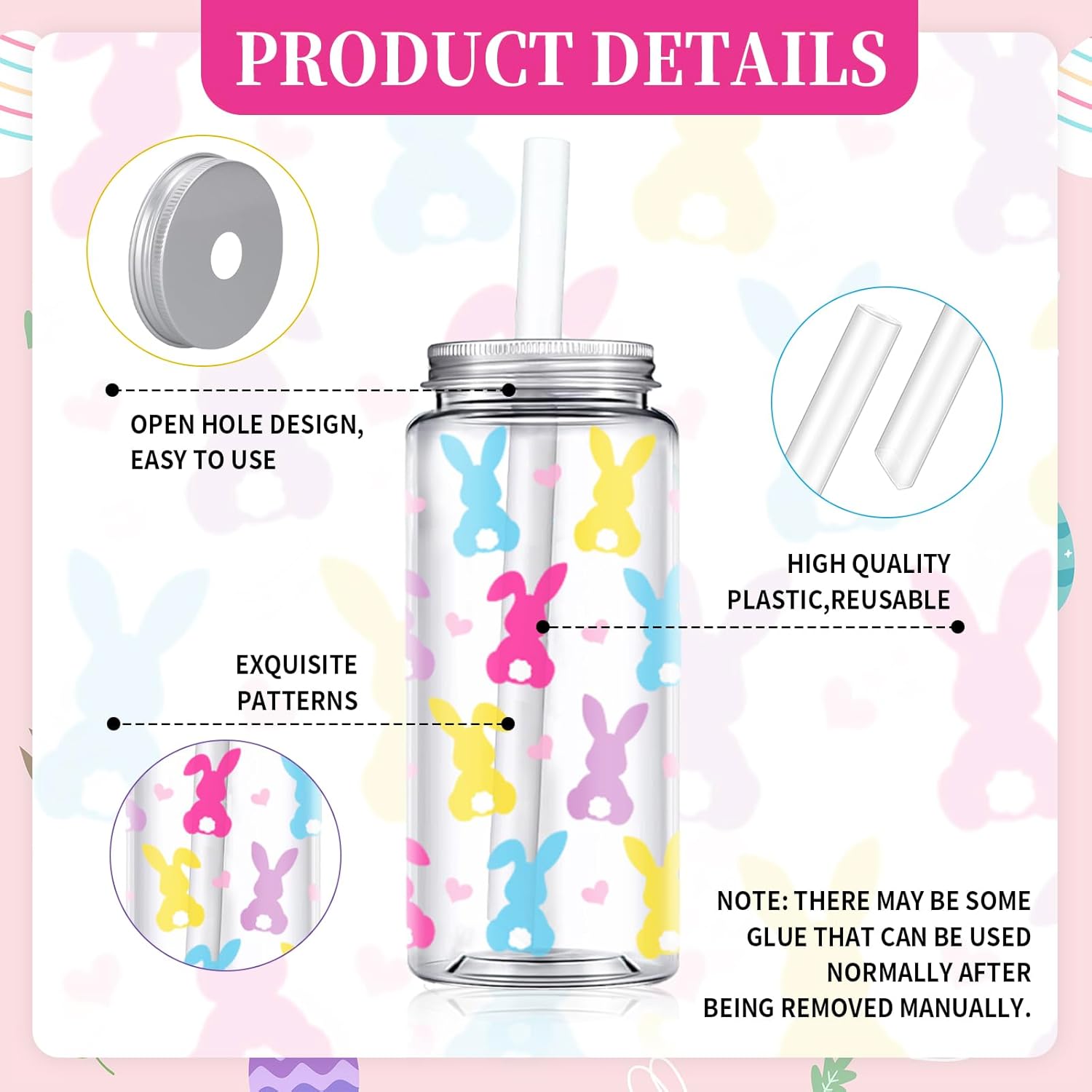 Features & Benefits: Our plastic cups come with patterns of cute bunny and hearts, etc., attractive and practical, bringing more fun and joy to your home and parties. They will not only add a great addition to your home, parties, and leisure time, but also can be shared with your family and friends, suitable for holding various beverages and homemade drinks. Specifications: Material: plastic Size: 2.5 x 5.6 inch Capacity: 13.5 oz Package includes: 20 x Plastic Cup with Lid and Straw